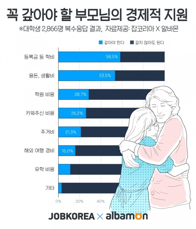 취업 포털 잡코리아가 아르바이트 포털 알바몬과 함께 19일 대학생 2866명을 대상으로 공동 설문한 결과, '부모님의 경제적 지원 중 어떤 것은 어떤 형태로든 갚아야 한다고 생각하는 것이 있는지' 묻는 항목에 95.4%의 대학생이 '그렇다'고 응답했다.
