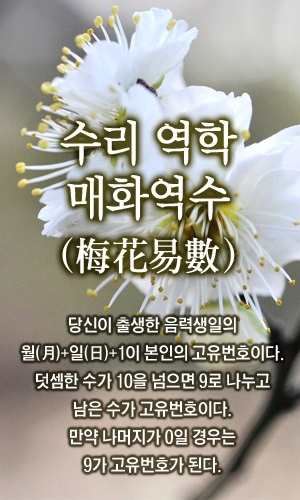 예) 출생일 1957년 2월 17일 (양력생일) 운세 보는법 : 음력으로 변환하면 1957년 1월 18일생 수리는 3번